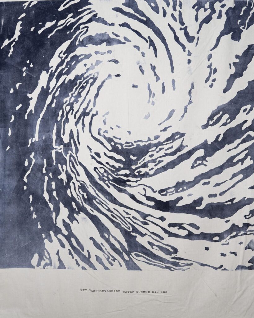 Let op: De doeken zijn al op reis geweest langs verschillende locaties. Daarom kunnen er sporen van gebruik of weersinvloeden op het wandkleed te zien zijn. Dit is onderdeel van dit kunstconcept. Laat het stromen!