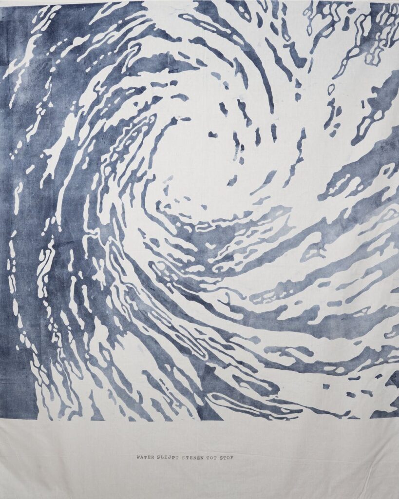 Let op: De doeken zijn al op reis geweest langs verschillende locaties. Daarom kunnen er sporen van gebruik of weersinvloeden op het wandkleed te zien zijn. Dit is onderdeel van dit kunstconcept. Laat het stromen!