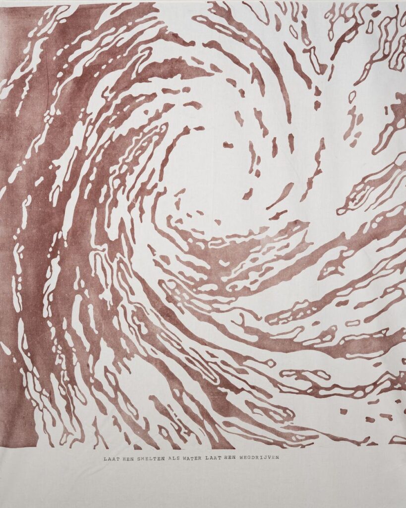 Let op: De doeken zijn al op reis geweest langs verschillende locaties. Daarom kunnen er sporen van gebruik of weersinvloeden op het wandkleed te zien zijn. Dit is onderdeel van dit kunstconcept. Laat het stromen!