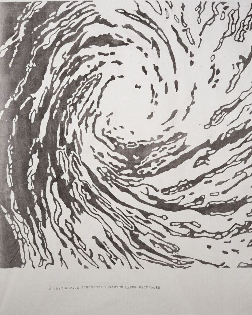 Let op: De doeken zijn al op reis geweest langs verschillende locaties. Daarom kunnen er sporen van gebruik of weersinvloeden op het wandkleed te zien zijn. Dit is onderdeel van dit kunstconcept. Laat het stromen!