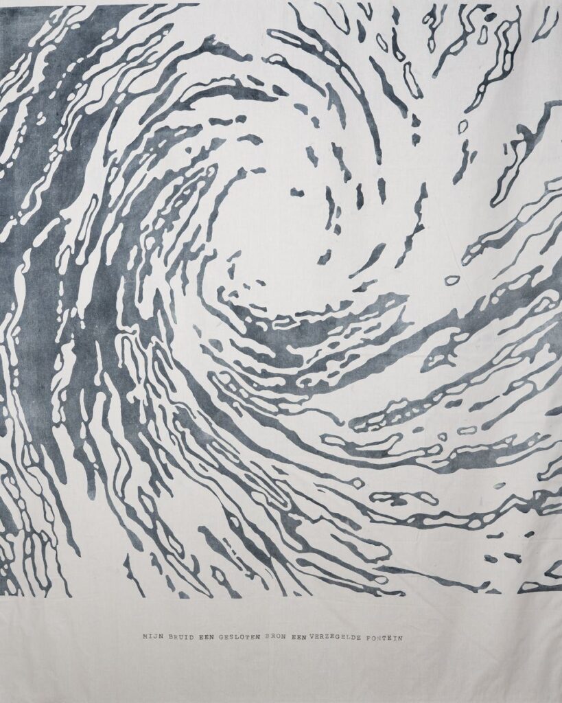 Let op: De doeken zijn al op reis geweest langs verschillende locaties. Daarom kunnen er sporen van gebruik of weersinvloeden op het wandkleed te zien zijn. Dit is onderdeel van dit kunstconcept. Laat het stromen!