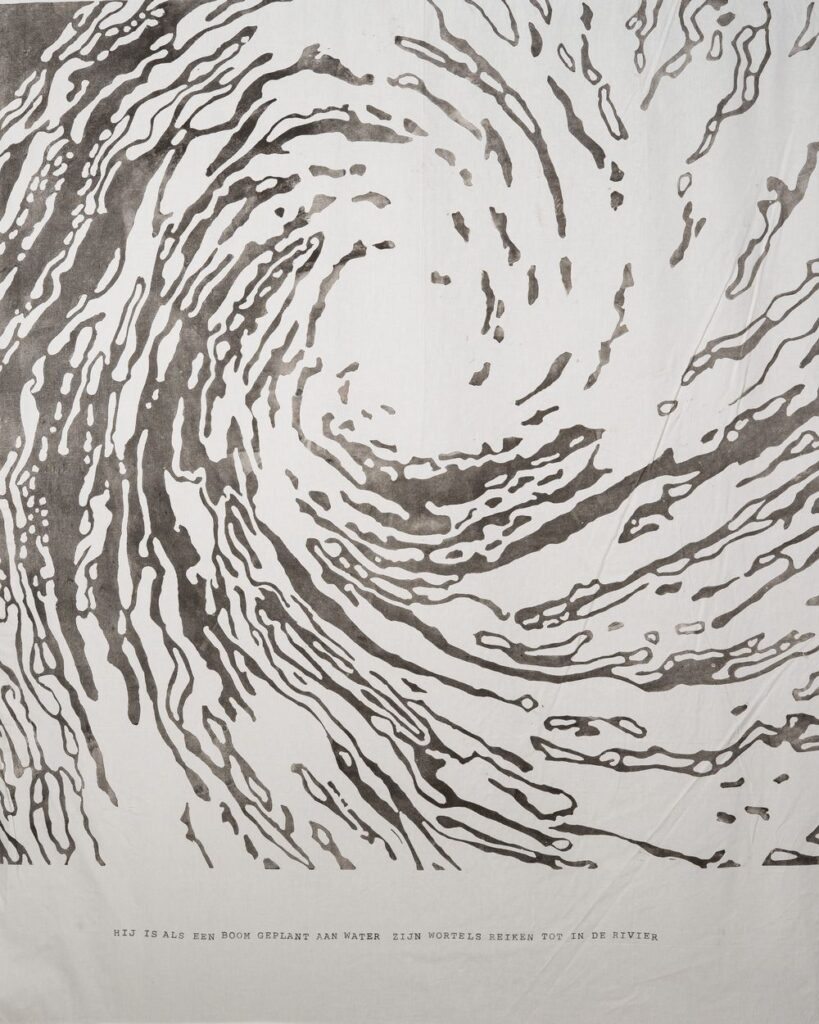 Let op: De doeken zijn al op reis geweest langs verschillende locaties. Daarom kunnen er sporen van gebruik of weersinvloeden op het wandkleed te zien zijn. Dit is onderdeel van dit kunstconcept. Laat het stromen!