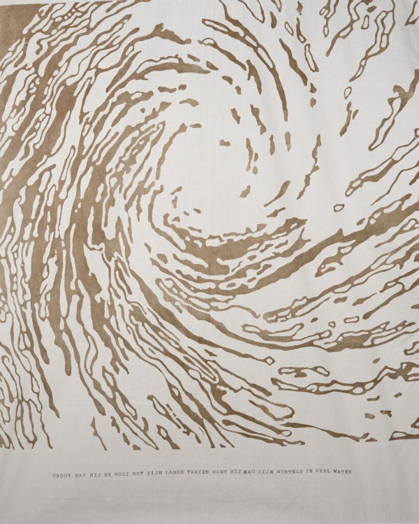 Let op: De doeken zijn al op reis geweest langs verschillende locaties. Daarom kunnen er sporen van gebruik of weersinvloeden op het wandkleed te zien zijn. Dit is onderdeel van dit kunstconcept. Laat het stromen!