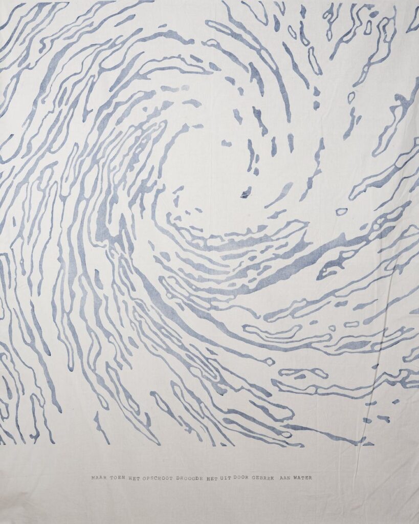 Let op: De doeken zijn al op reis geweest langs verschillende locaties. Daarom kunnen er sporen van gebruik of weersinvloeden op het wandkleed te zien zijn. Dit is onderdeel van dit kunstconcept. Laat het stromen!