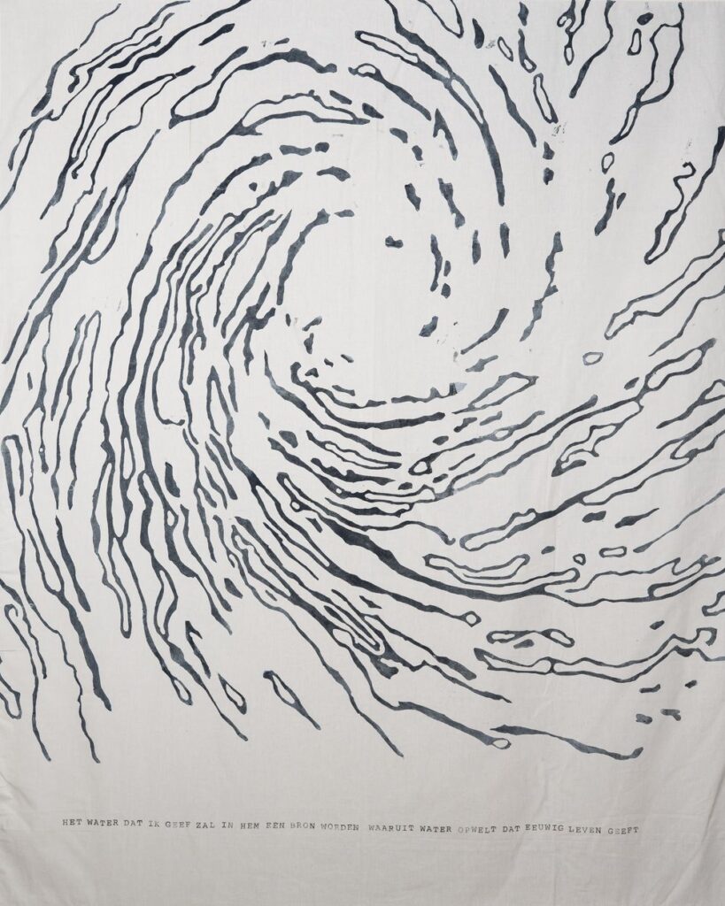 Let op: De doeken zijn al op reis geweest langs verschillende locaties. Daarom kunnen er sporen van gebruik of weersinvloeden op het wandkleed te zien zijn. Dit is onderdeel van dit kunstconcept. Laat het stromen!
