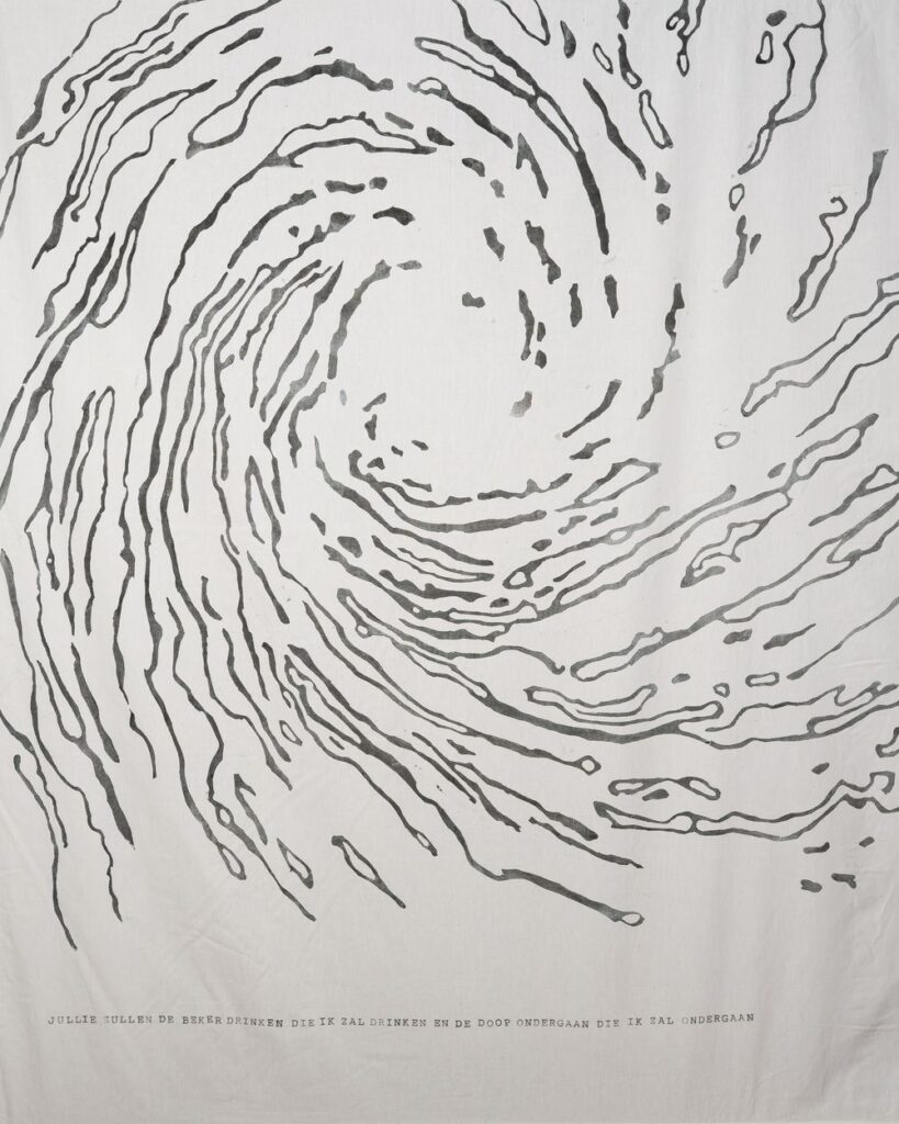 Let op: De doeken zijn al op reis geweest langs verschillende locaties. Daarom kunnen er sporen van gebruik of weersinvloeden op het wandkleed te zien zijn. Dit is onderdeel van dit kunstconcept. Laat het stromen!