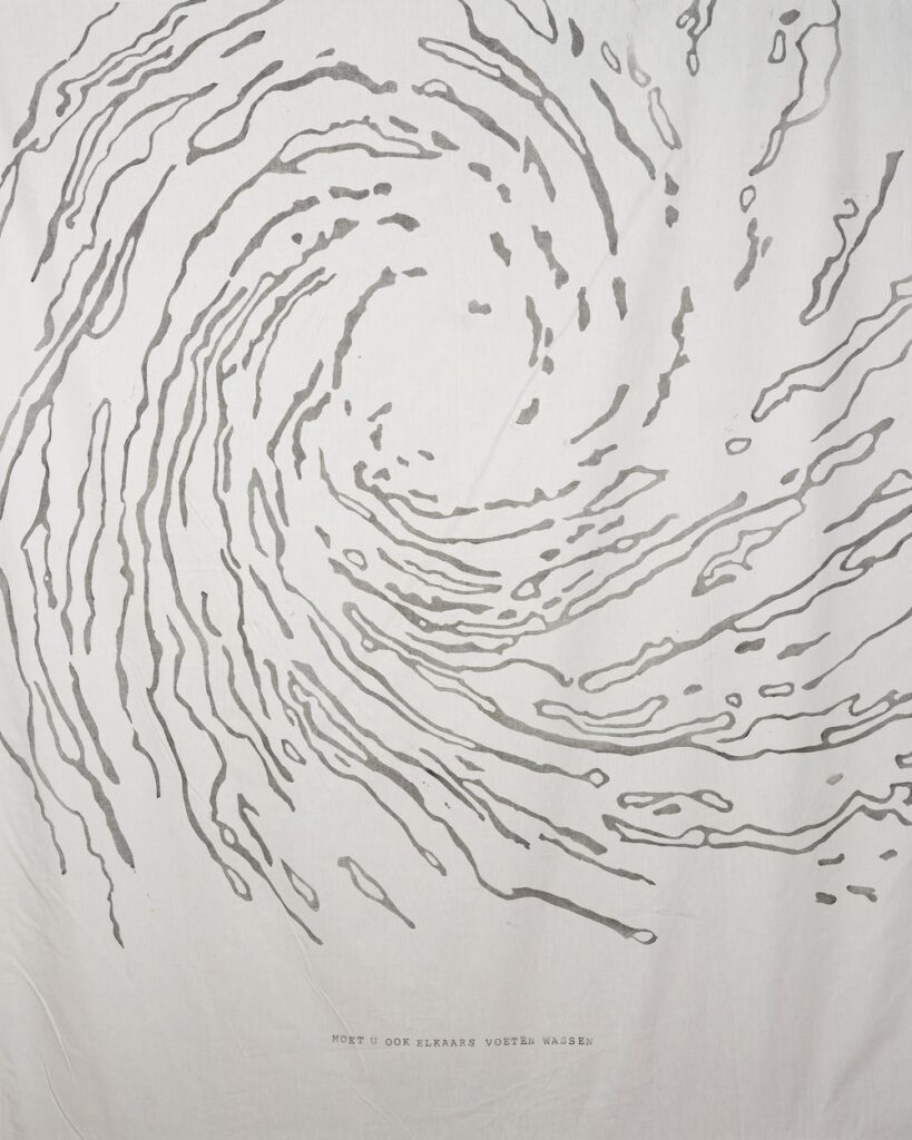 Let op: De doeken zijn al op reis geweest langs verschillende locaties. Daarom kunnen er sporen van gebruik of weersinvloeden op het wandkleed te zien zijn. Dit is onderdeel van dit kunstconcept. Laat het stromen!