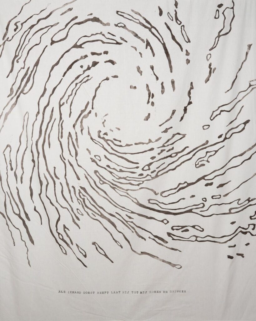 Let op: De doeken zijn al op reis geweest langs verschillende locaties. Daarom kunnen er sporen van gebruik of weersinvloeden op het wandkleed te zien zijn. Dit is onderdeel van dit kunstconcept. Laat het stromen!