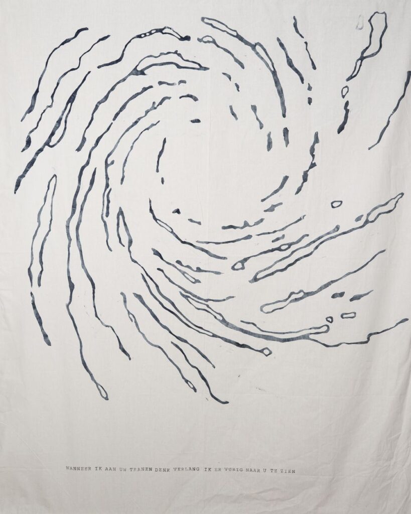 Let op: De doeken zijn al op reis geweest langs verschillende locaties. Daarom kunnen er sporen van gebruik of weersinvloeden op het wandkleed te zien zijn. Dit is onderdeel van dit kunstconcept. Laat het stromen!