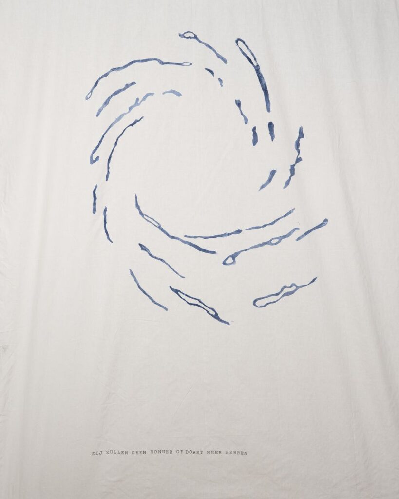 Let op: De doeken zijn al op reis geweest langs verschillende locaties. Daarom kunnen er sporen van gebruik of weersinvloeden op het wandkleed te zien zijn. Dit is onderdeel van dit kunstconcept. Laat het stromen!