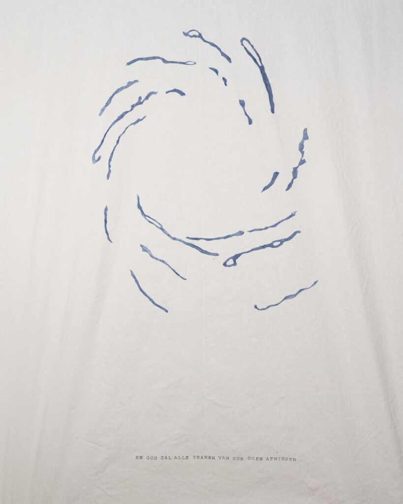 Let op: De doeken zijn al op reis geweest langs verschillende locaties. Daarom kunnen er sporen van gebruik of weersinvloeden op het wandkleed te zien zijn. Dit is onderdeel van dit kunstconcept. Laat het stromen!