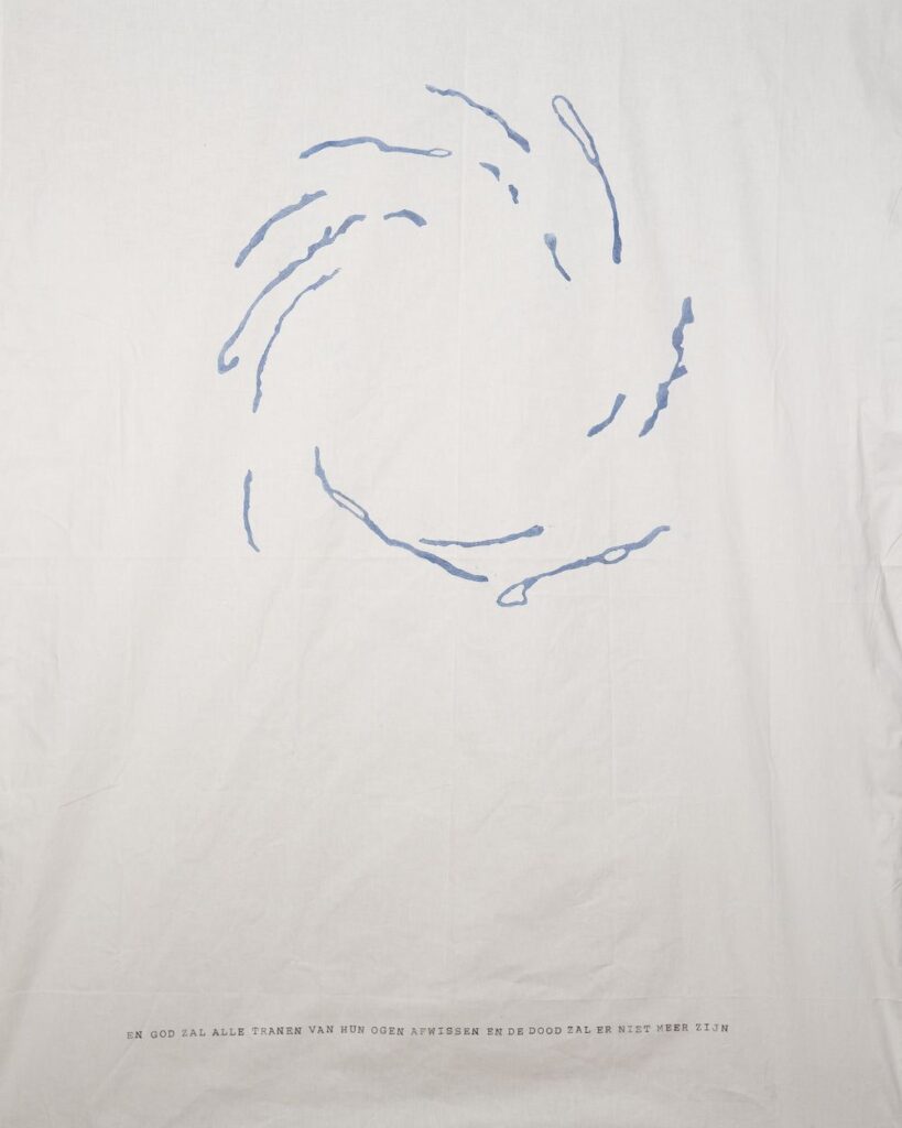 Let op: De doeken zijn al op reis geweest langs verschillende locaties. Daarom kunnen er sporen van gebruik of weersinvloeden op het wandkleed te zien zijn. Dit is onderdeel van dit kunstconcept. Laat het stromen!